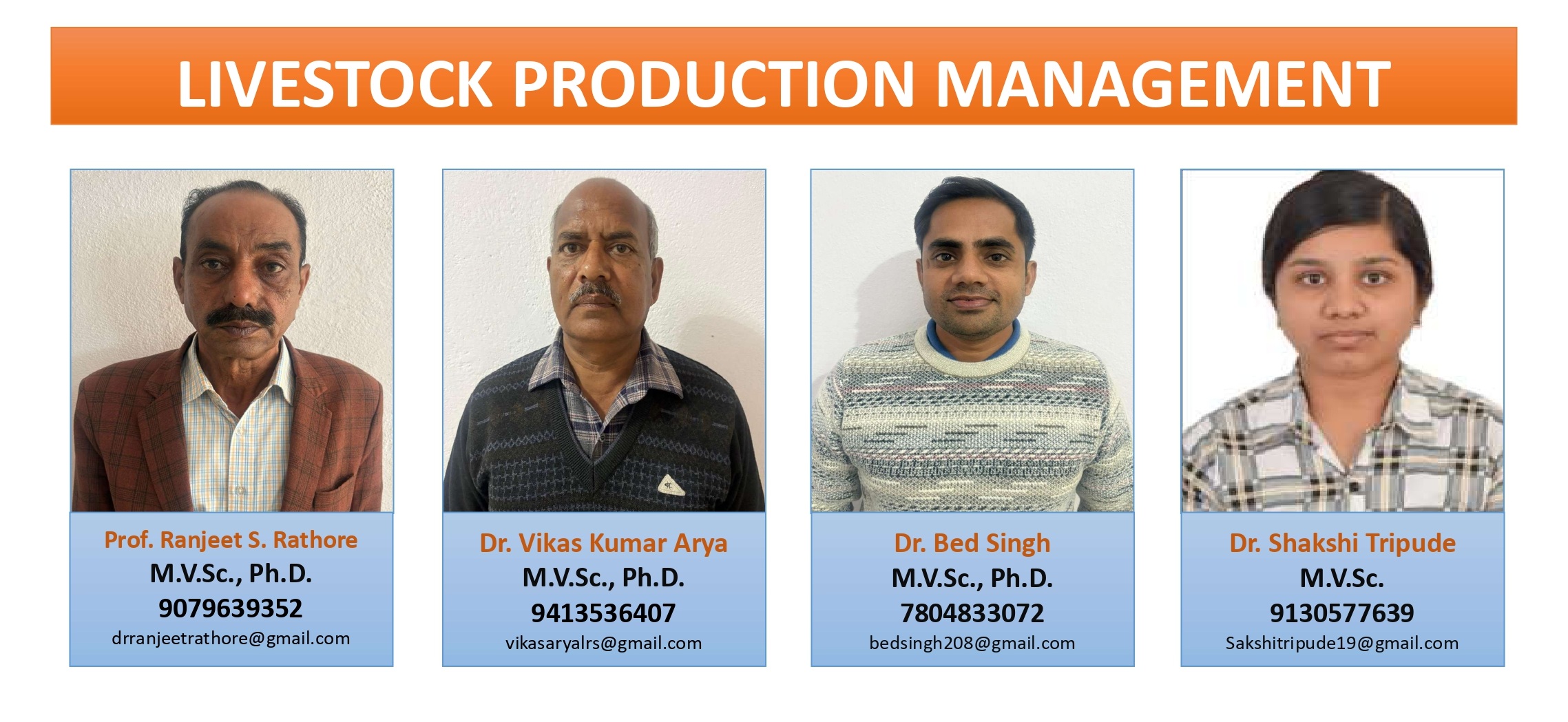 The Department of Livestock Production and Management (LPM) at Ramkumari College of Veterinary Sciences is dedicated to imparting knowledge and skills in scientific livestock production, management practices, and sustainable animal husbandry systems. The department focuses on improving the productivity, health, and welfare of livestock species while ensuring economic viability for farmers and livestock owners.